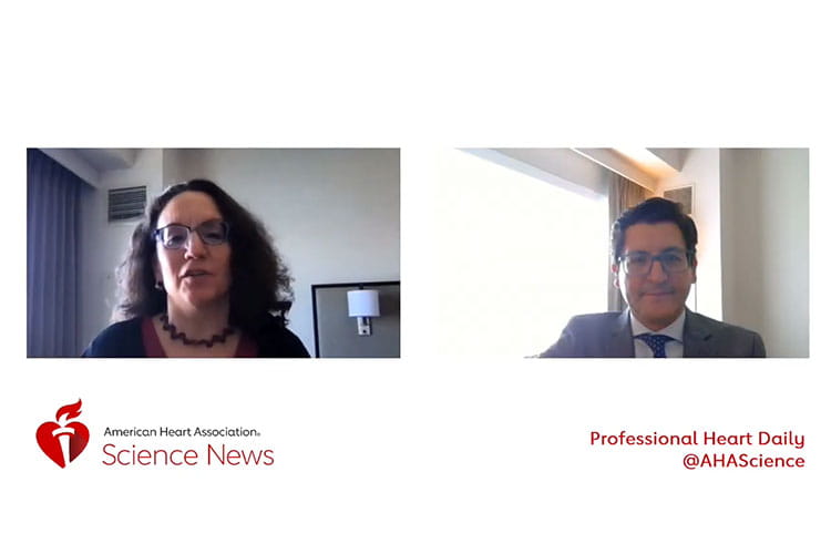 Moderator Stephanie Watts, PhD, FAHA and presenter Andres Contreras, DVM, MS, PhD discuss the science presented in a session on recent advances in hypertension that looked at the role of adipose tissue and adiposity in regulating blood pressure over the lifespan.